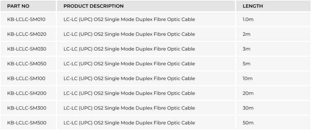 LC-LC (UPC) OS2 Single Mode Duplex Fibre Optic Cable (KB-LCLC-SM0xx)