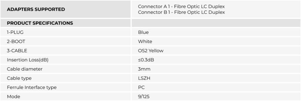 The KAYBE OS2 LC-LC Single Mode Duplex Fibre Optic Patch Cable delivers reliable high-speed connectivity for 100G networks, supporting CWDM across a wide 1260–1625 nm wavelength range for strong signal performance over long distances. Constructed with 9/125 µm single-mode fibre, it is laser-optimized for data centers and remains backward compatible with OS1 networks. Precision ceramic ferrules ensure accurate alignment with insertion loss below 0.3 dB, while UPC-polished LC connectors provide superior return loss. Its bend-insensitive design minimizes signal loss and exceeds ITU-T G652.D/G657.A1 and IEC standards. The LSZH flame-retardant jacket emits minimal smoke and toxic fumes, making it ideal for safe installations in data centers, industrial, transport, and residential environments.