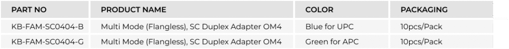 The KAYBE Multi mode (Flangeless) SC Duplex Adapter OM4 is designed to align and connect SC duplex OM4 multimode fibre connectors with high precision. Its flangeless structure supports flexible installation in high-density patch panels and fibre cassettes. Engineered for stable optical performance, it ensures reliable connectivity for high-speed OM4 multimode networks in data centers and enterprise environments.