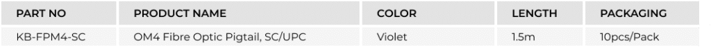 The KAYBE OM4 Fibre Optic Pigtail with SC/UPC connector is designed for ultra-high-speed multimode networks, supporting 40G and 100G data transmission. It provides low insertion loss and superior optical performance, ensuring reliable connectivity in data centers and high-bandwidth applications. Equipped with precision SC/UPC connectors and high-quality OM4 fibre, it delivers stable and efficient splicing and network operation.